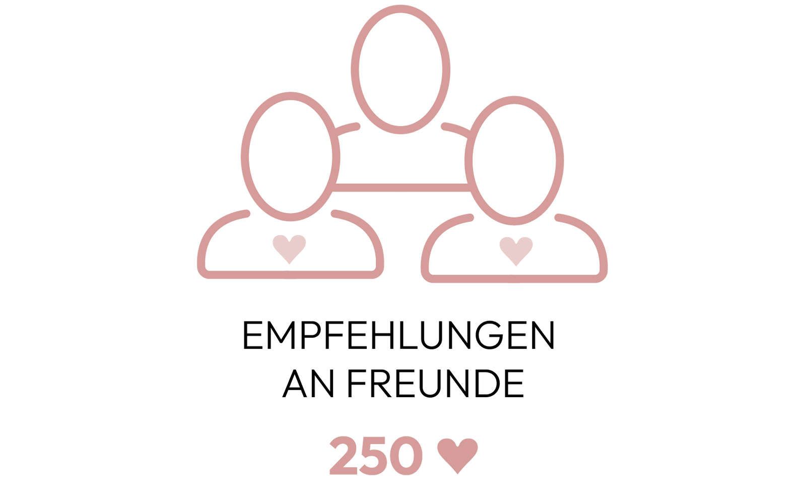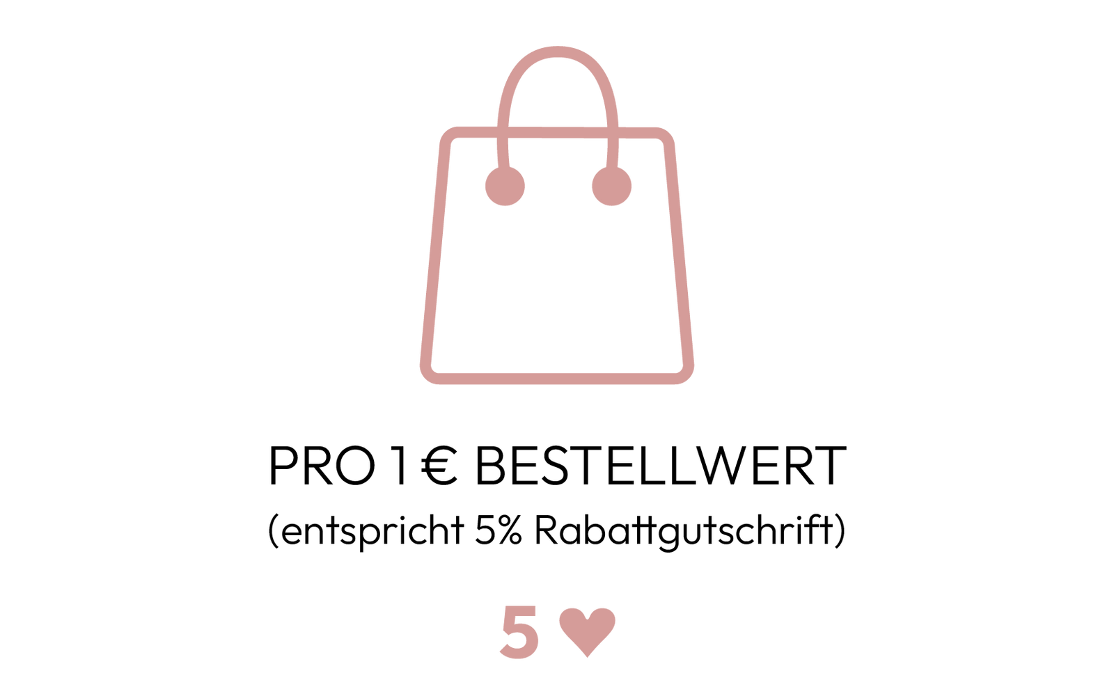 Du erhältst bereits 100 Herzen für deine Anmeldung. Zudem sammelst du bei jedem Kauf und jeder Empfehlung bei Freunden und Bekannten Herzen.